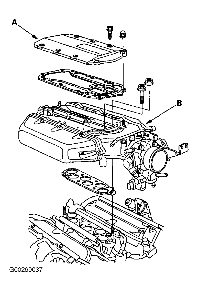12. Remove the upper cover (A), then remove the intake manifold (B). See Figure.