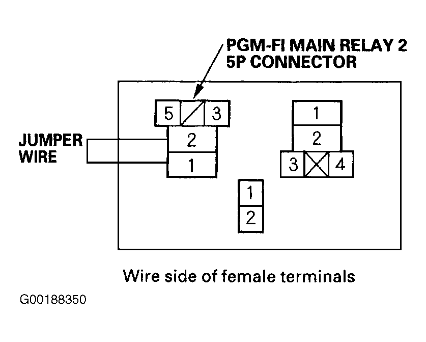 - Turn ignition off. Disconnect PGM-FI main relay No. 2. Connect a fused jumper wire between PGM-FI main relay harness connector terminals No. 1 and 2. See Fig 2