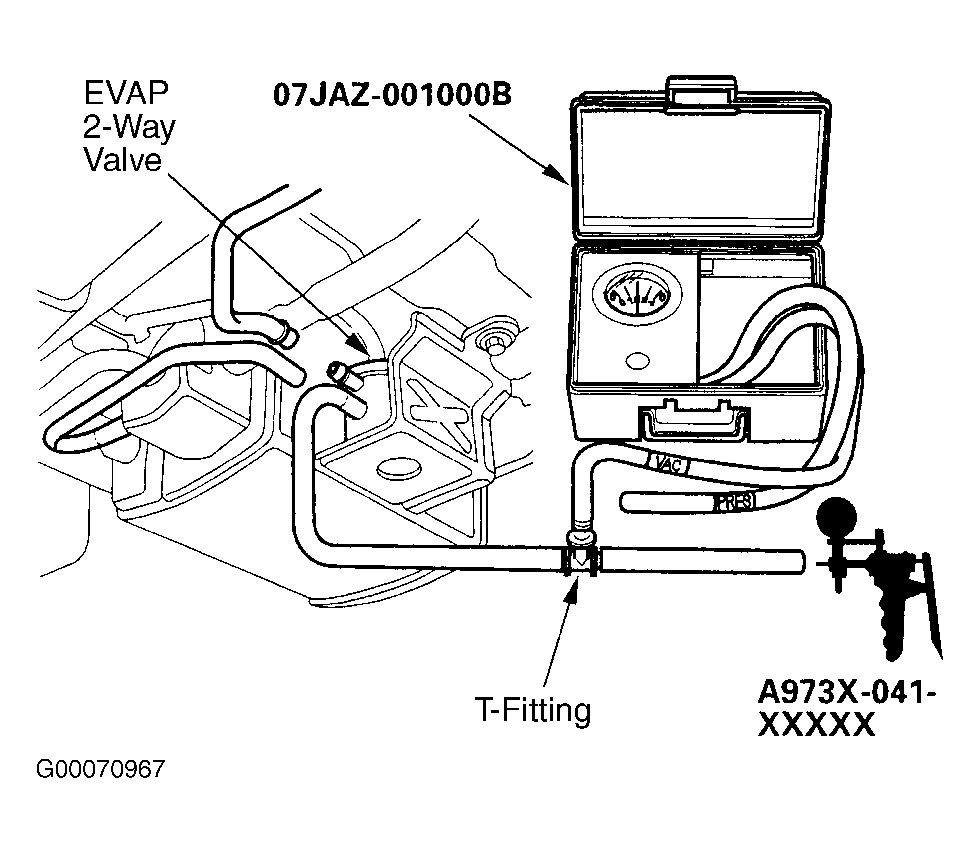 - Remove fuel filler cap. Remove fuel tank vapor hoses from EVAP 2-way valve. For location of EVAP 2-way valve, see VACUUM DIAGRAMS article. Connect hose to available EVAP 2 way valve port from "T" fitting connected to a vacuum pump/gauge. See Fig 4