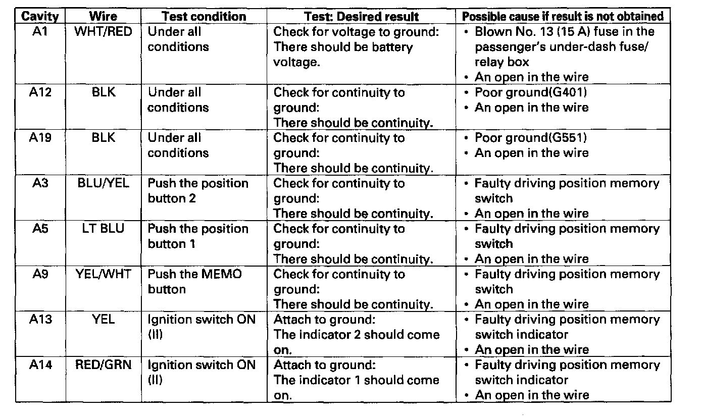 Control Unit Input Test1. Before testing the driving position memory control functions, troubleshoot the multiplex control system.
