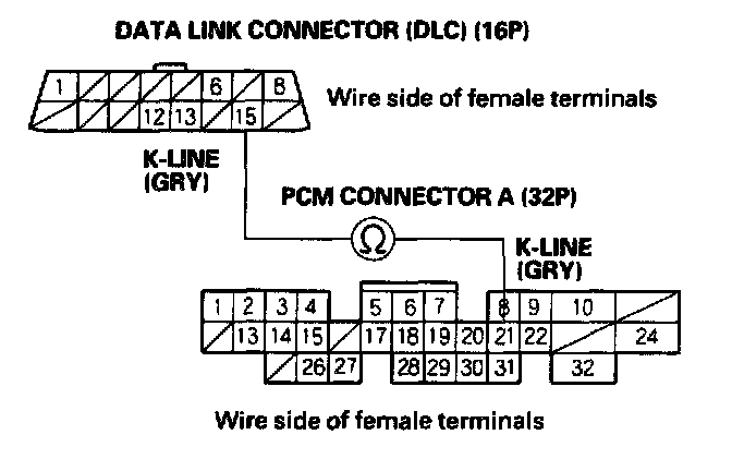 NO - Repair open in the wire between DLC terminal No. 15 and the PCM (A21). After repairing the wire, check the DTC with the OBD II scan tool/Honda PGM Tester, then go to the DTC Troubleshooting Index.