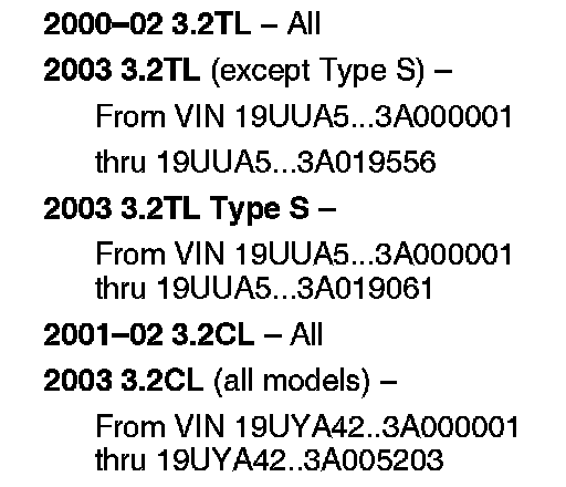 1. On 2000 3.2TLs and 2001 3.2CLs within the applicable VIN ranges, install a new fuel pressure regulator. For 3.2TLs, refer to page 11-173 of the 1999-03 3.2TL Service Manual. For 3.2CLs, refer to page 11-187 of the 2001-03 3.2CL Service Manual.
