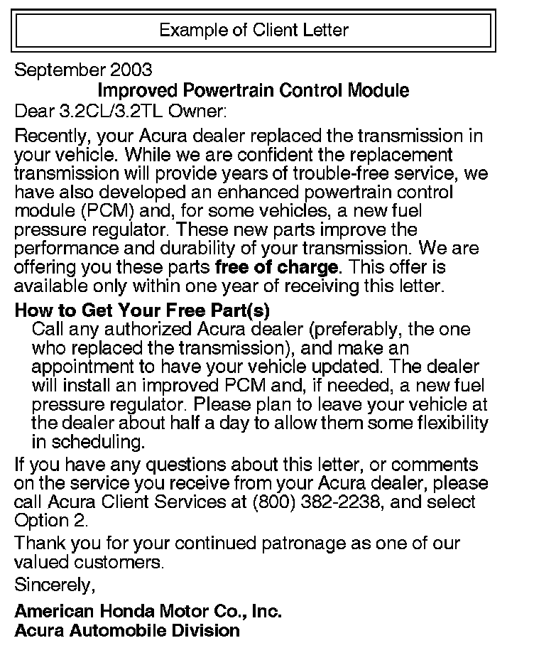 *Some vehicles that received a remanufactured transmission also need a new PCM to improve the performance and durability of the transmission. In addition, to complete the repair on certain 2000 3.2TLs and 2001 3.2CLs, a new fuel pressure regulator is needed.*
