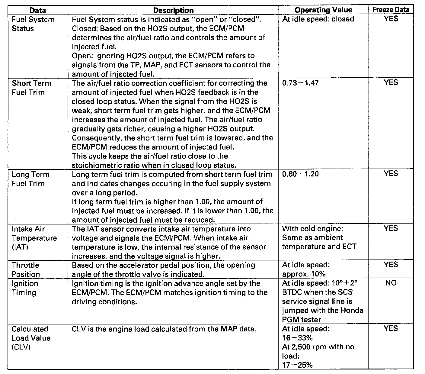 ECM/PCM DataYou can retrieve data from the ECM/PCM by connecting the OBD II scan tool or the Honda PGM Tester to the Data Link Connector (DLC). The items listed in the table below conform to SAE recommended practice. The Honda PGM Tester also reads data beyond that recommended by SAE. Understanding this data may help you find the causes of intermittent problems.
