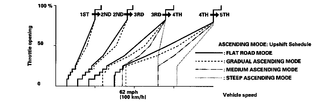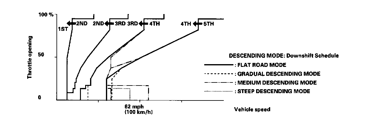 When the PCM determines that the vehicle is going down a hill in D5, D4 and D3 positions, and the sequential sportshift mode position, the shift-up speed from 4th to 5th gear, 3rd to 4th gear, and from 2nd to 3rd (when the throttle is closed) becomes faster than the set speed for flat road driving to widen the 4th gear, 3rd gear, and 2nd gear driving areas. This, in combination with engine braking from the deceleration lock-up, achieves smooth driving when the vehicle is descending. There are three descending modes with different 4th gear driving areas, 3rd gear driving areas and 2nd gear driving areas according to the magnitude of a gradient stored in the PCM. When the vehicle is in 5th or 4th gear and you are decelerating while applying the brakes on a steep hill, the transmission will downshift to a lower gear. When you accelerate, the transmission will then return to a higher gear.