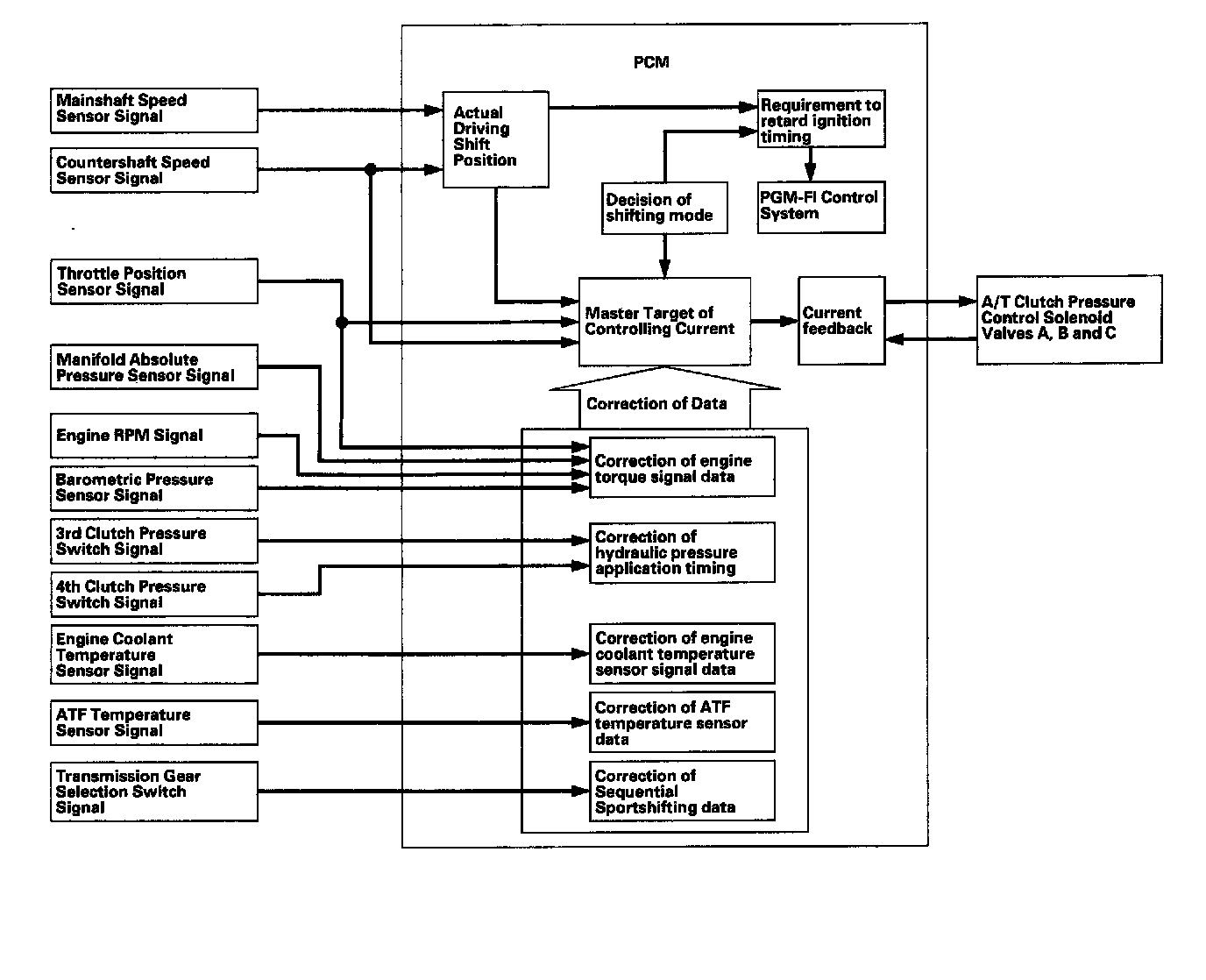 The PCM receives input signals from the various sensors and switches, performs processing data, and outputs a correct to the A/T clutch pressure control solenoid valves A, B, and C.