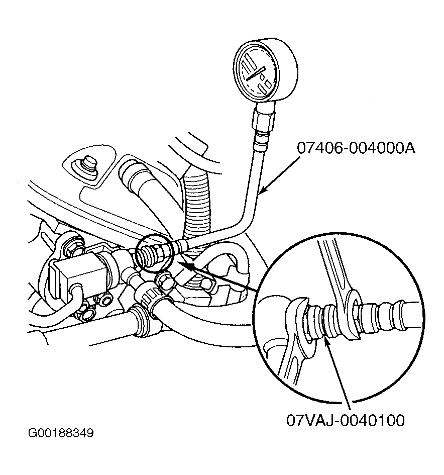 2. Remove fuel line bolt and install fuel pressure gauge adapter (07VAJ-0040100). Attach fuel pressure gauge. See Fig 1 .