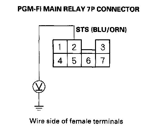 9. Shift to Park, then turn the ignition switch to the START (III) position, and measure voltage between body ground and PGM-FI main relay 7P connector terminal No.2.