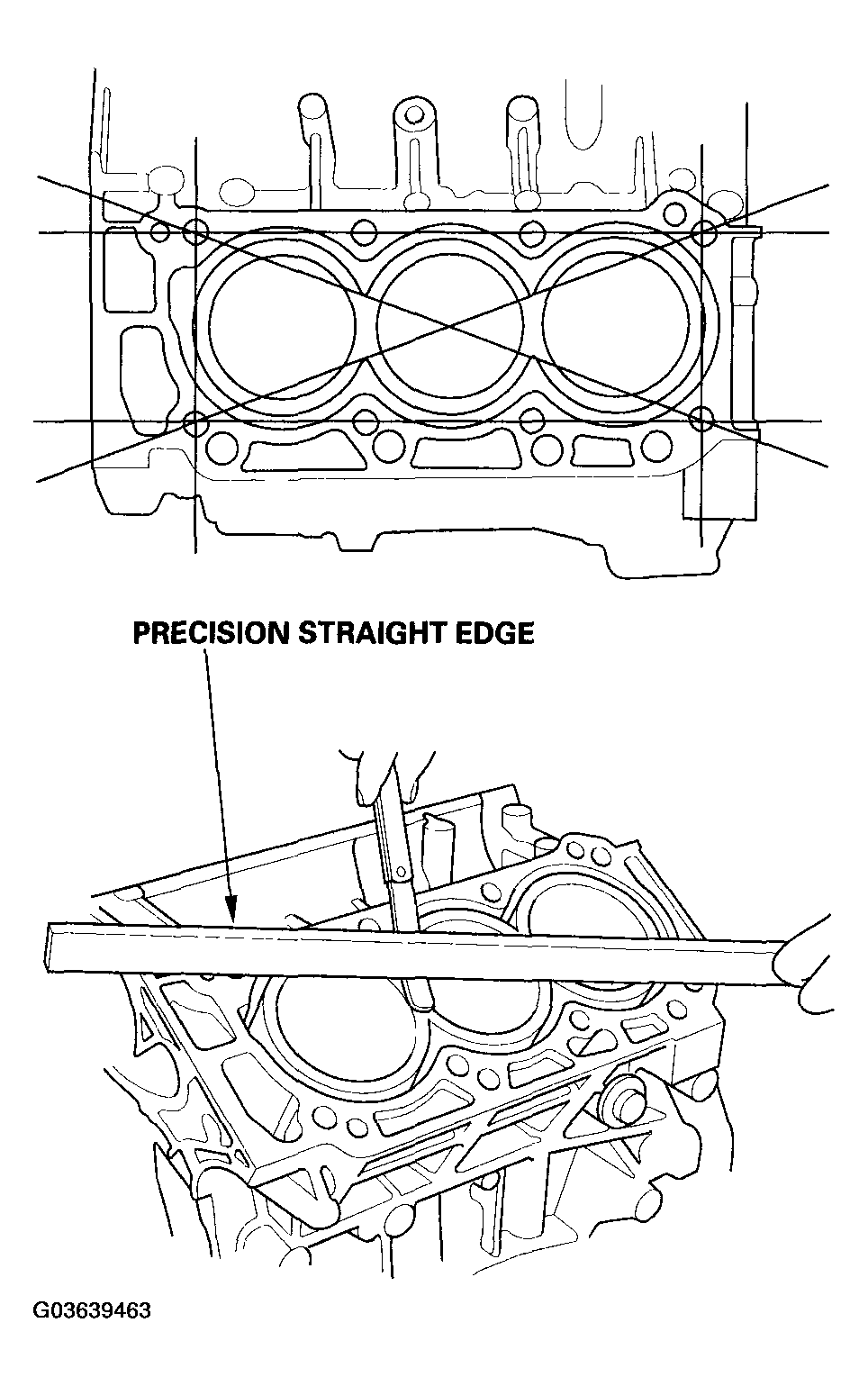 - Check the top of the engine block for warpage. Measure along the edges and across the center as shown in Fig 3