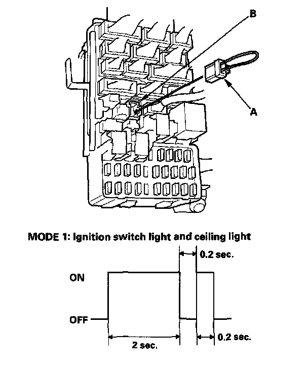 4. Check self-diagnosis function Mode 1 for a diagnostic trouble code (DTC) by connecting the special tool (A) to the multiplex control inspection connector (B). After about 5 seconds, the ignition switch light and ceiling light should come on for 2 seconds, go out, then blink 0.2 second. This means that you are in Mode 1 of the self-diagnosis function.