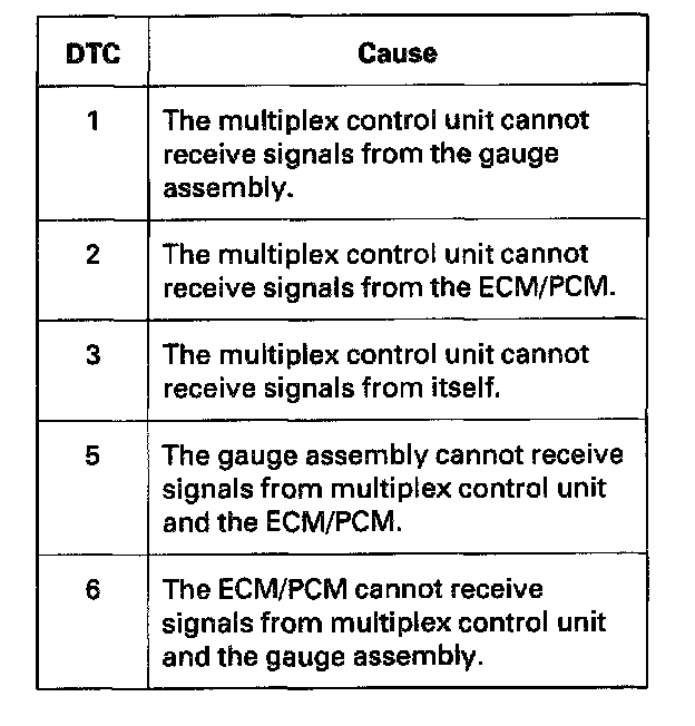 - DTC 1, and 6 simultaneously: Check for an open in the WHT/GRN wire between multiplex control unit terminal K10 and gauge assembly terminal B13, If the wire is OK, substitute a known-good multiplex control unit, gauge assembly, and ECM/PCM one at a time, in that order, and recheck for the DTCs after each substitution.