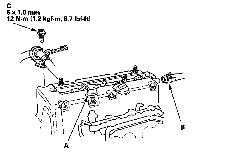 Cylinder Head Cover, (A) P/S Hose Bracket, (B) Oil Dipstick, (C) Breather Hose.: