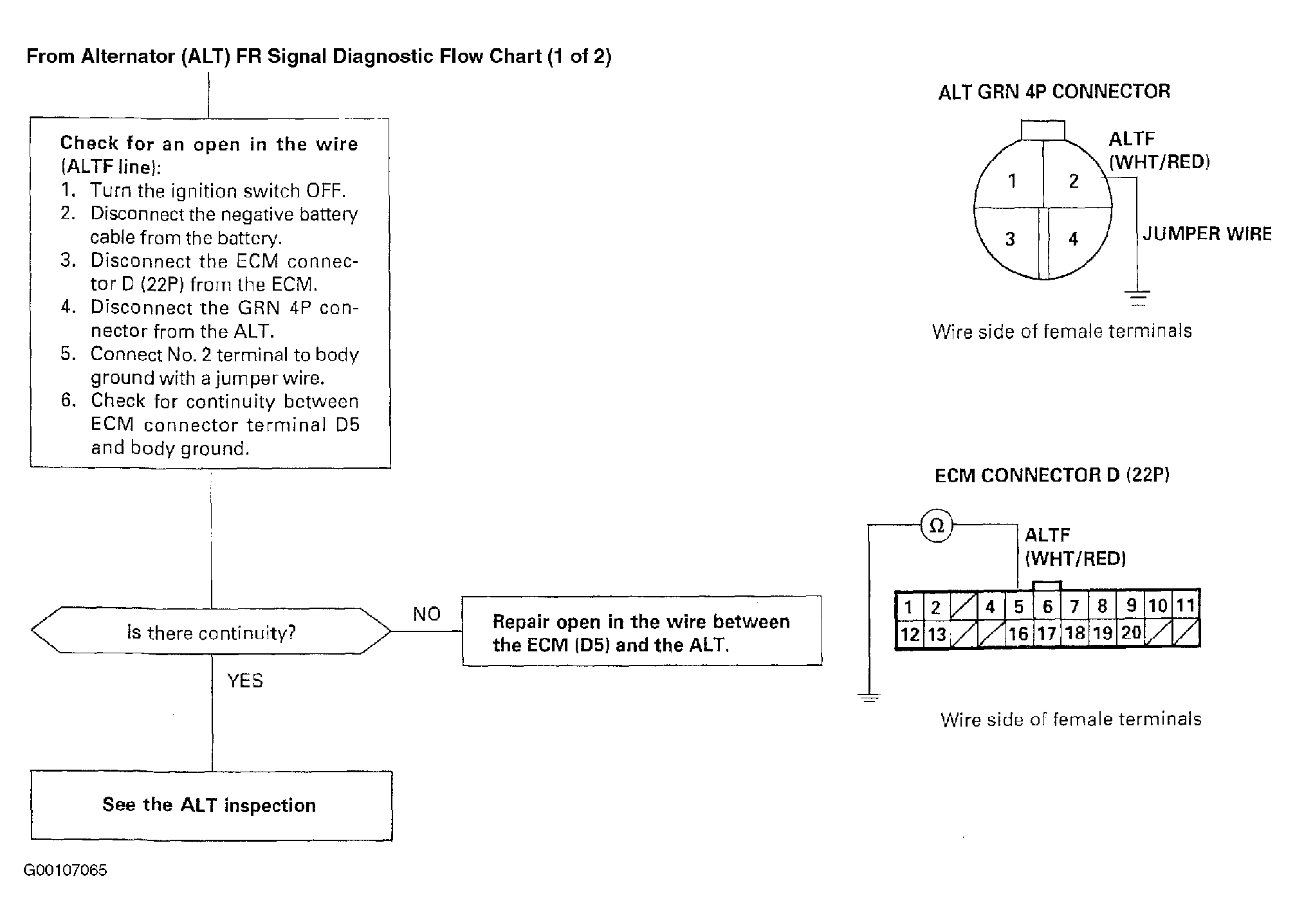 This signals the ECM when the alternator (ALT) is charging. For troubleshooting of the ALT FR signal circuit, see Fig 1 and Fig 2 . ECM is located behind passenger seat. See Figure .
