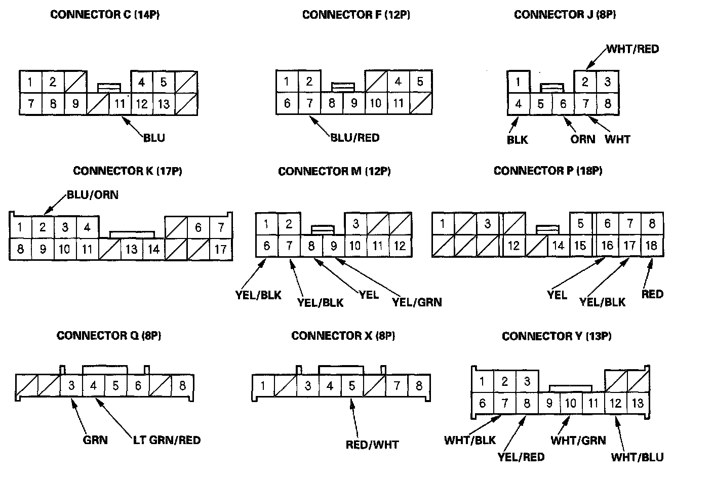 6. Reconnect all connectors to the under-dash fuse/relay box, and make these input tests at the appropriate connectors on the under-dash fuse/relay box