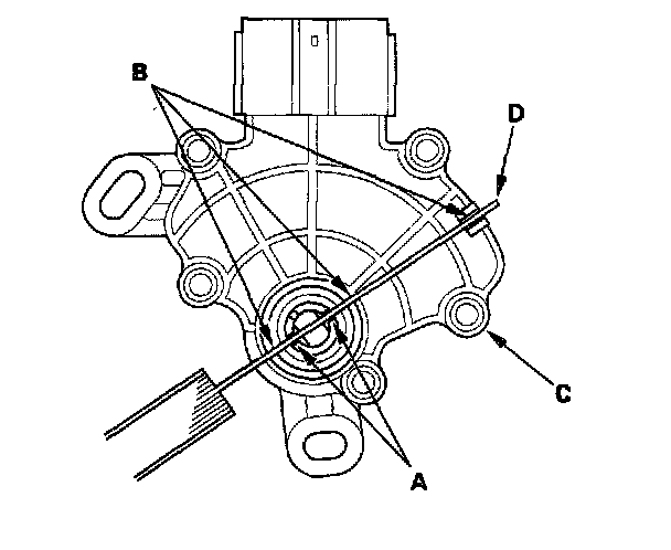 7. Align the cutout (A) on the rotary-frame with the neutral positioning cutouts (B) on the transmission range switch (C), then put a 2.0 mm (0.08 inch) feeler gauge blade (D) in the cutouts to hold it in the N position.