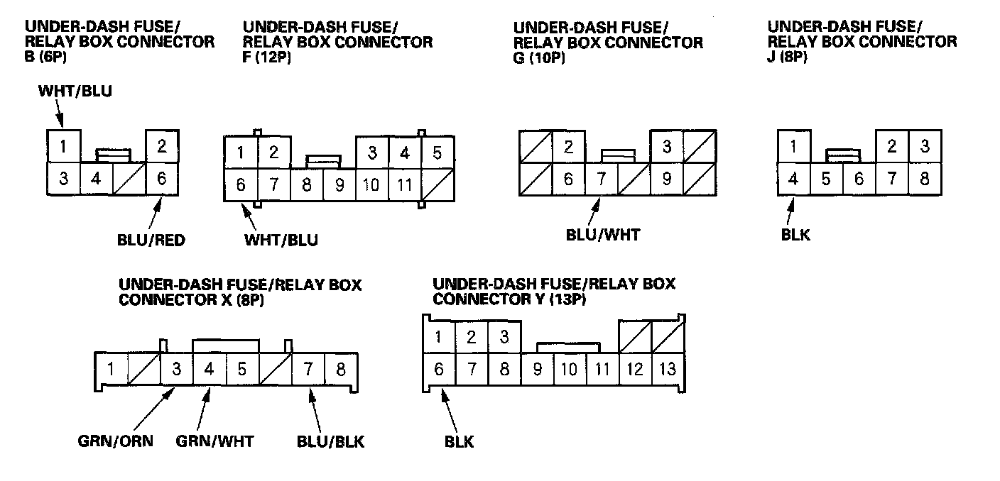 6. Disconnect the X connector from the under-dash fuse/relay box, and make these input tests at the connector