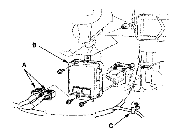 4. Disconnect the connectors (A) from the climate control unit (B), then remove the wire harness clip (C), the self-tapping screws and the climate control unit