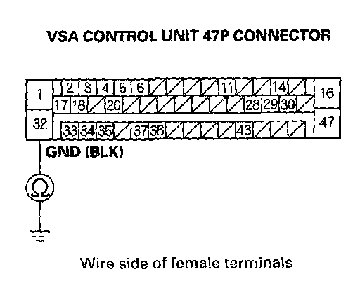 18. Check for continuity between VSA control unit 47P connector terminal No.32 and body ground.