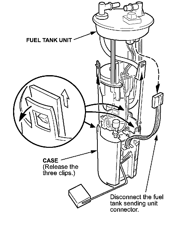 5. Remove the clip, then remove the fuel pressure regulator. Install the new regulator with new 0-rings. Reassemble the fuel tank unit.
