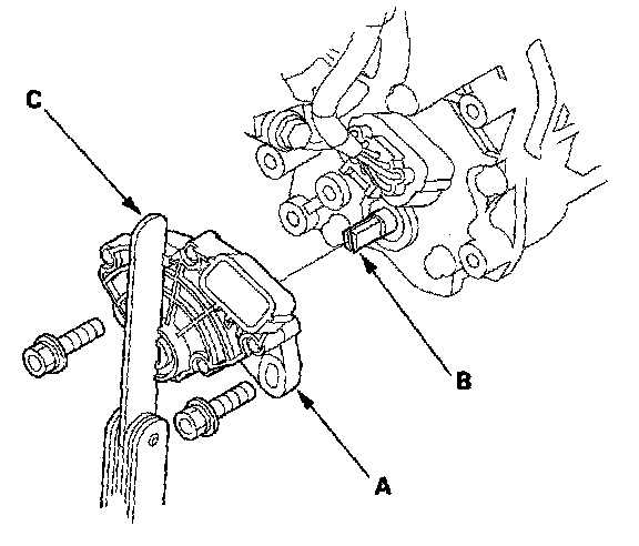 7. Align the cutouts (A) on the rotary-frame with the neutral positioning cutouts (B) on the transmission range switch (C) then put a 2.0 mm (0.08 inch) feeler gauge blade (D) in the cutouts to hold the switch in the N position.