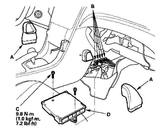 9. Remove the bolts (C), then remove the ECM/PCM (D).