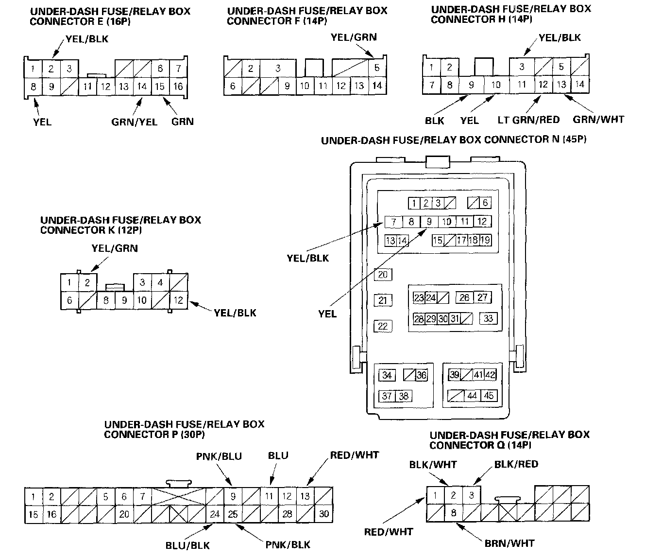6. Reconnect all connectors to the under-dash fuse/relay box, and make these input tests at the appropriate connectors on the under-dash fuse/relay box.
