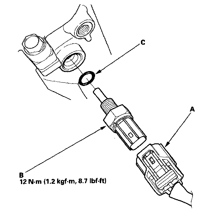 6. Install the sensor in the reverse order of removal with a new O-ring (C), then refill the radiator with engine coolant, and bleed air from the cooling system with the heater valve open.