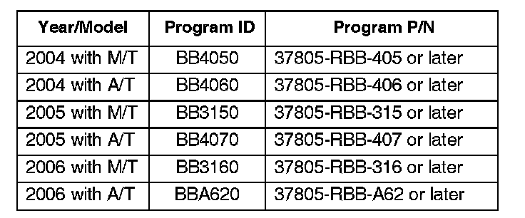 The updated PGM-FI software program IDs and P/Ns are shown below. If this, or a later program ID, is the Current Program ID displayed during the update, the software for this service bulletin is already installed.