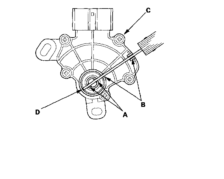 7. Align the cutouts (A) on the rotary-frame with the neutral positioning cutouts (B) on the transmission range switch (C), then put a 2.0 mm (0.08 inch) feeler gauge blade (D) in the cutouts to hold the switch in the [N] position.