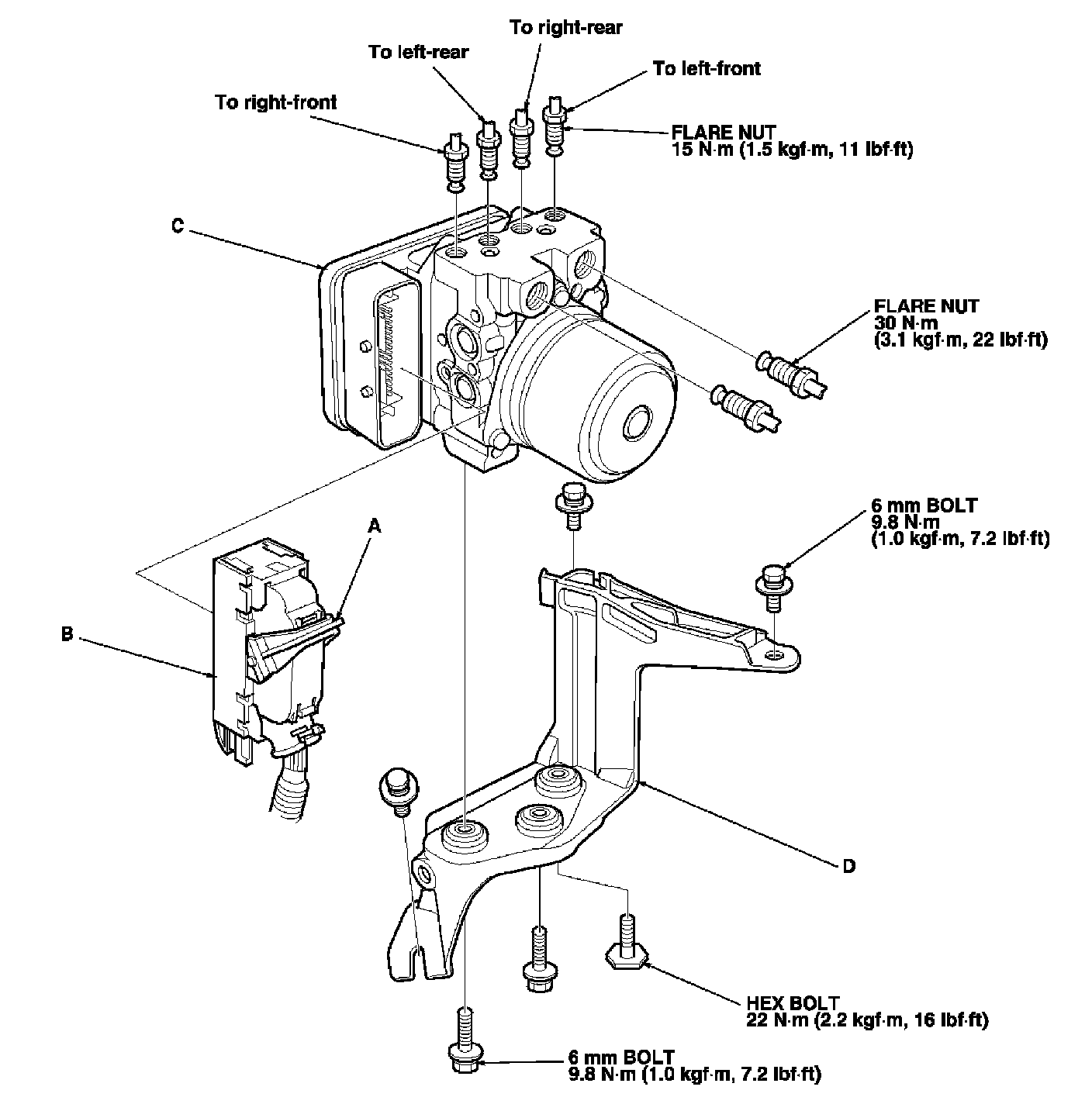 3. Remove the three 6 mm bolts, then remove the VSA modulator-control unit/bracket (C/D) from the body.