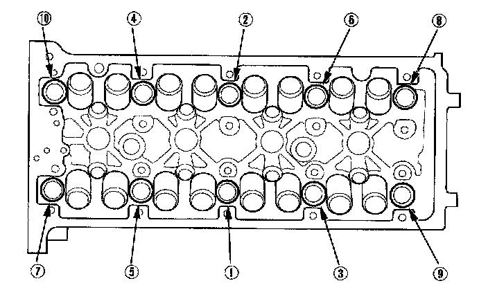 Tighten the cylinder head bolts in sequence to 39 Nm (4.0 kgf-m, 29 ft. lbs.). Use a beam-type torque wrench. When using a preset-type torque wrench, be sure to tighten slowly and do not overtighten.