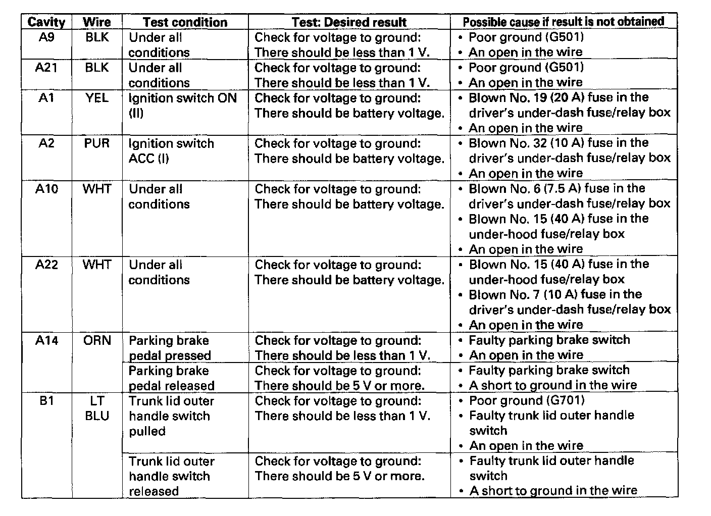 6. Reconnect the connectors to the keyless access control unit, and make these input tests at the connectors.