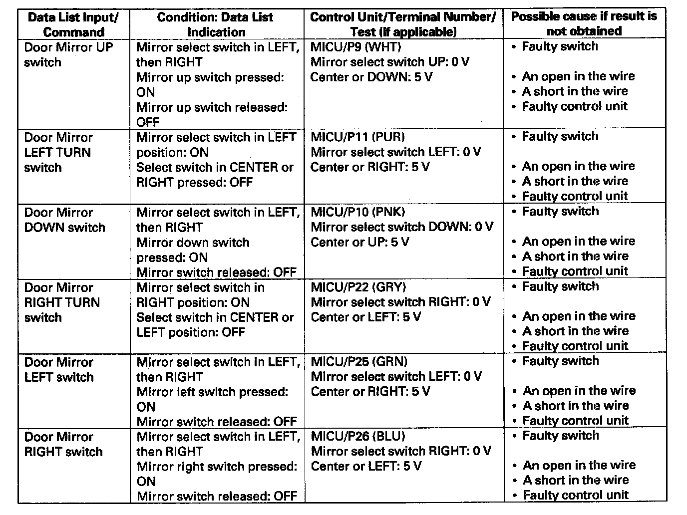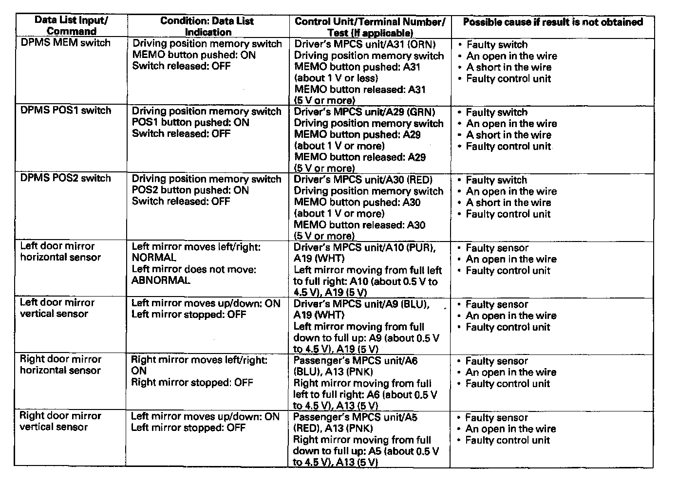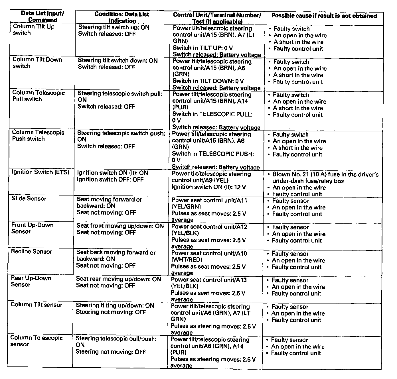 - If the data list indication is not correct, perform the appropriate test at the control unit and terminal indicated in the table.