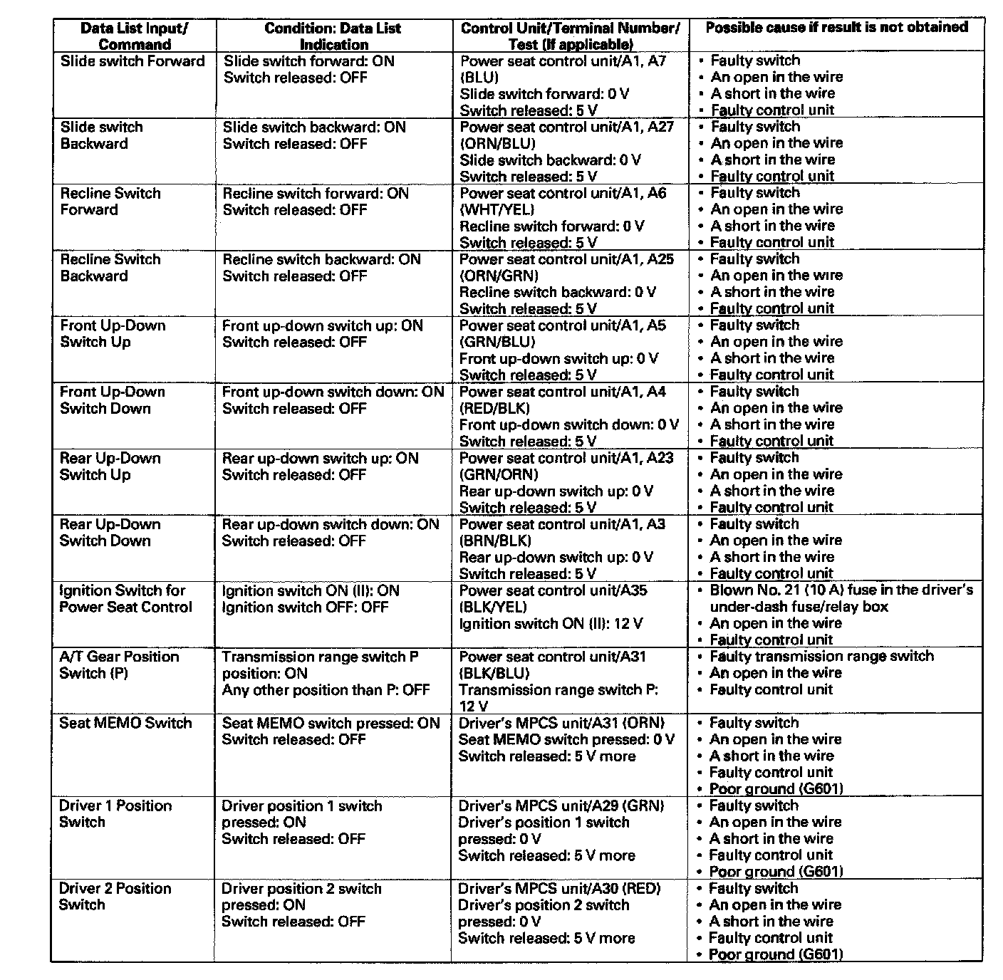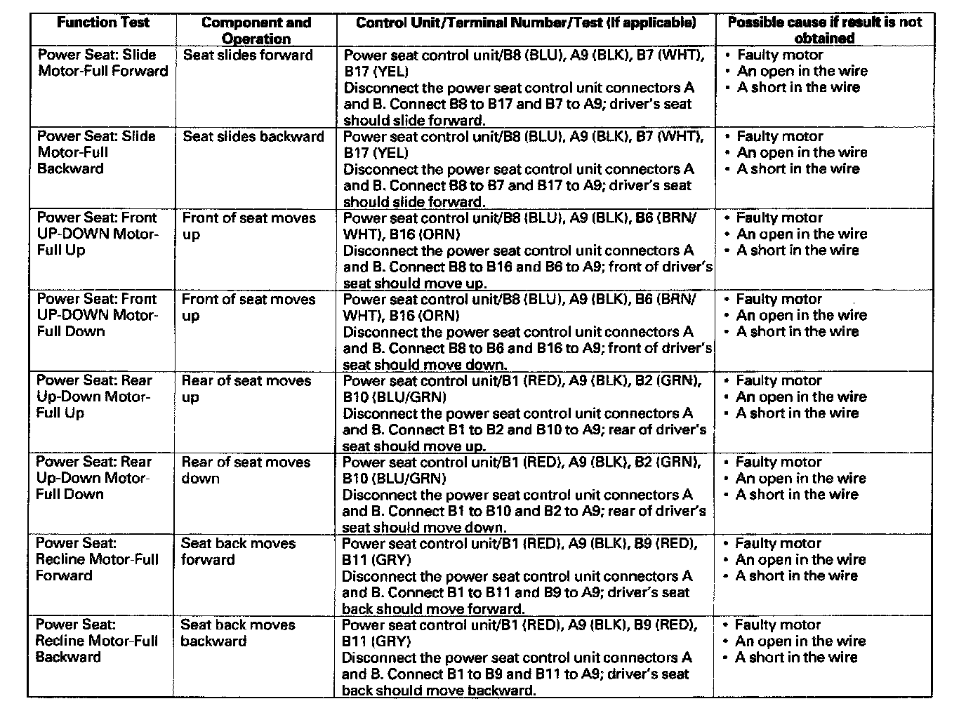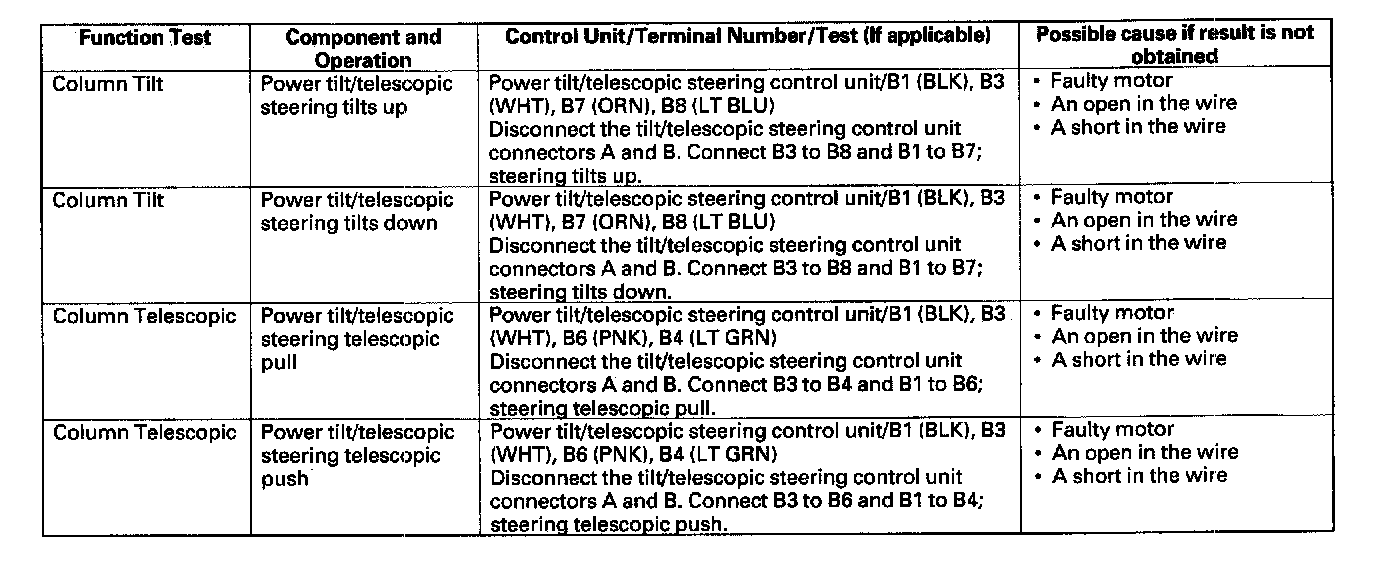 - If the function does not occur, do the appropriate test at the control unit and terminal indicated in the table.