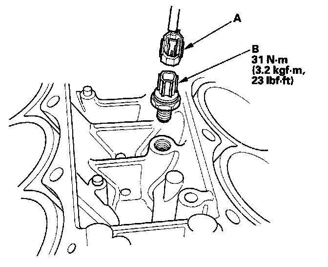 3. Disconnect the knock sensor connector (A), then remove the knock sensor (B).
