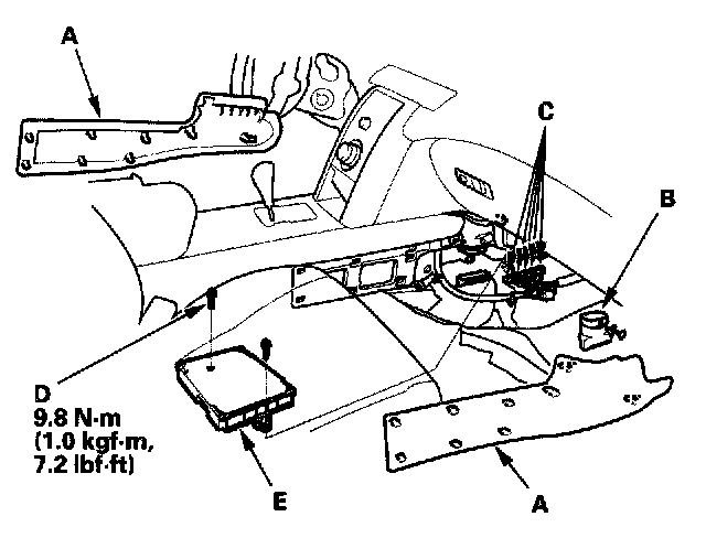 12. Remove the bolts (D), then remove the PCM (E).