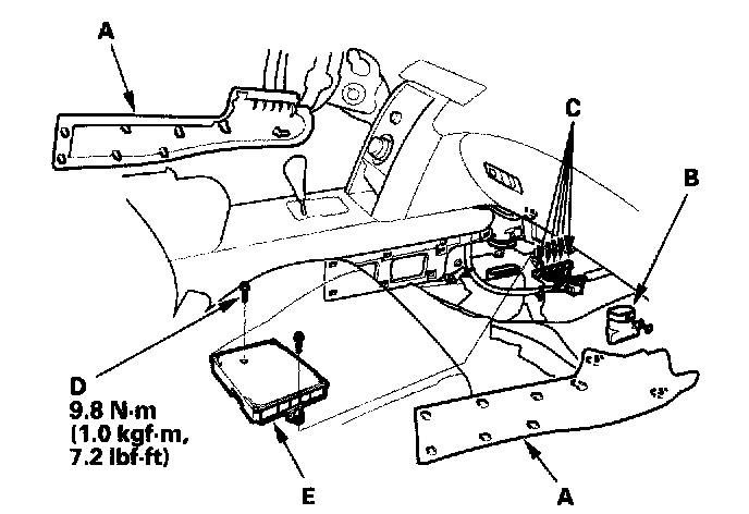 9. Remove the two bolts (D), and remove the PCM (E).
