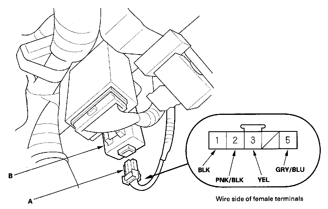 2. Disconnect the 5P connector (A) from the keyless receiver unit (B).