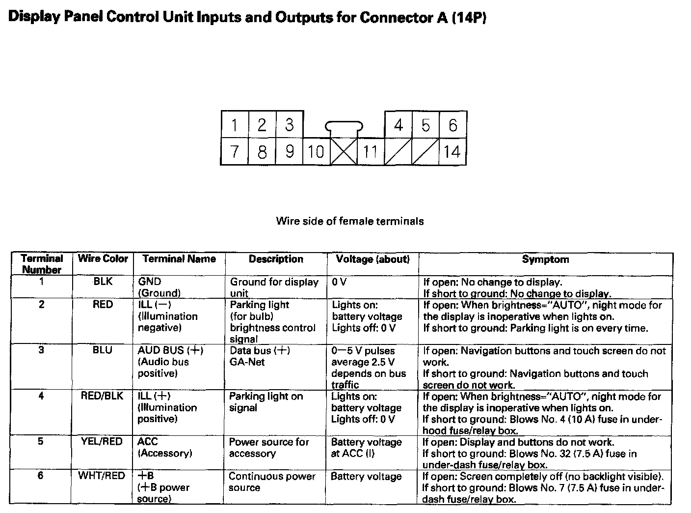 Display Panel Control Unit Inputs And Outputs For Connector A (14P):