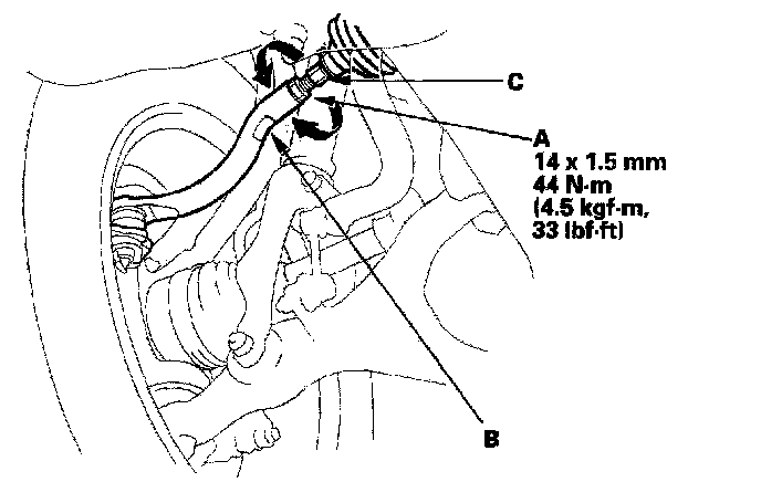 3. Loosen the tie-rod locknuts (A) while holding the flat surface sections (B) of the tie-rod end with a wrench, and turn both rack ends (C) until the front toe is within specifications.