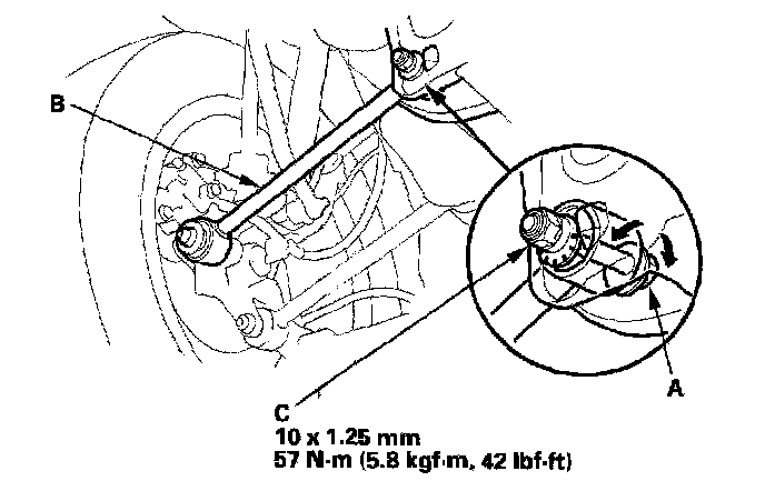 3. Hold the adjusting bolt (A) on the rear control arm (B), and loosen the self-locking nut (C).