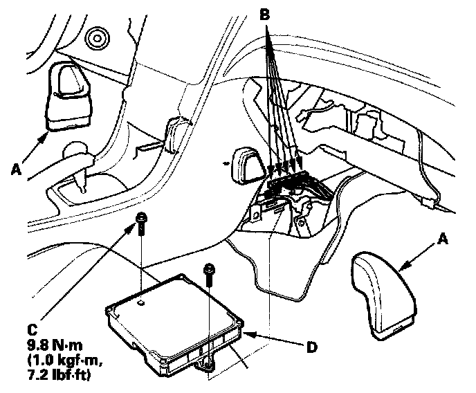 11. Remove the bolts (C), then remove the ECM/PCM (D).