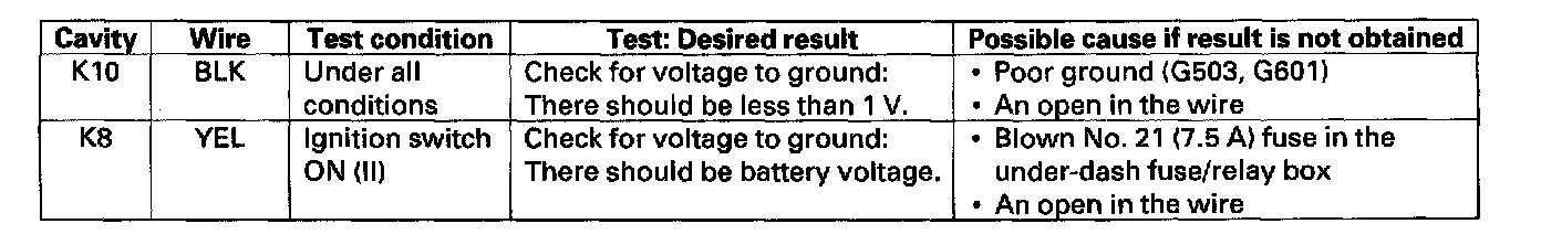 5. Disconnect the 10P connector from the under-hood fuse/relay box, and make these input tests at the connector.