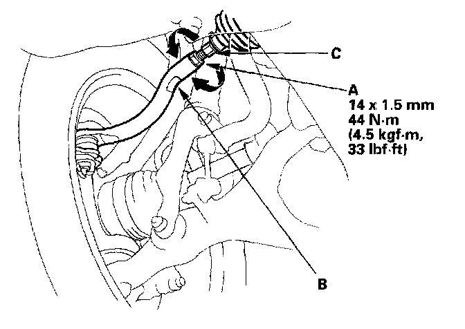 3. Loosen the tie-rod locknuts (A) while holding the flat surface sections (B) of the tie-rod end with a wrench, and turn both rack ends (C) until the front toe is within specifications.