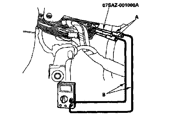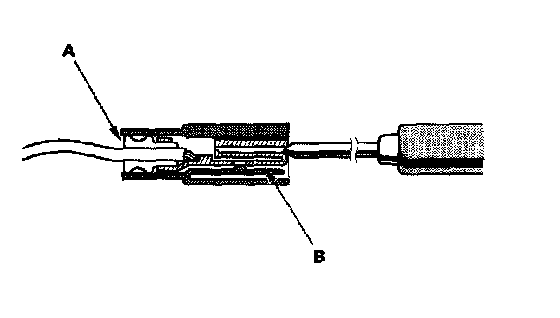 3. If you cannot get to the wire side of the connector or the wire side is sealed (A), disconnect the connector and probe the terminals (B) from the terminal side. Do not force the probe into the connector.