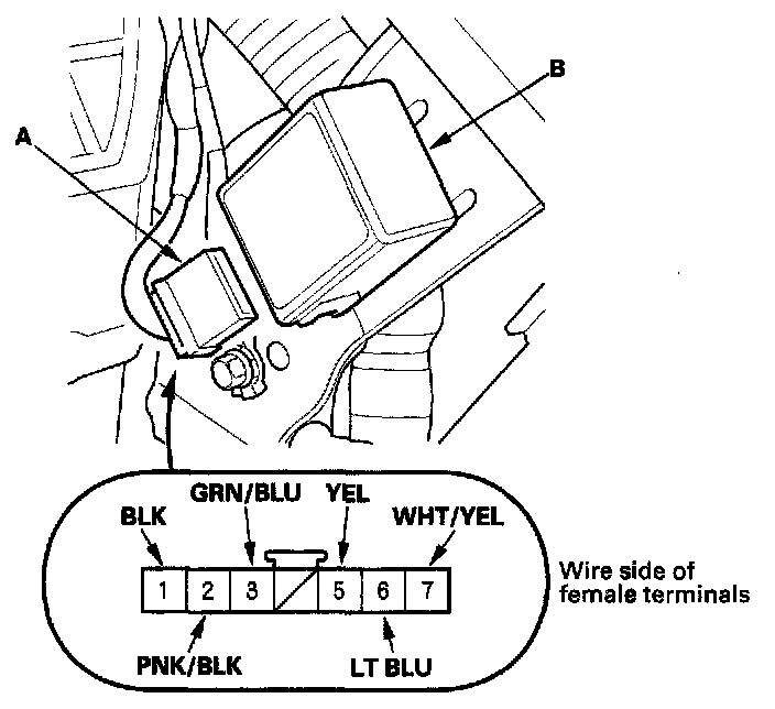 2. Disconnect the 7P connector (A) from the keyless receiver unit (B).