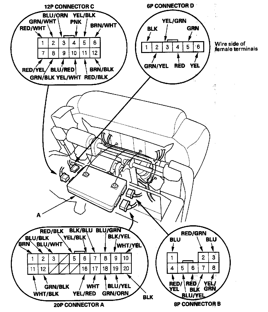 2. Disconnect the connectors from the driver's power seat control unit (A).