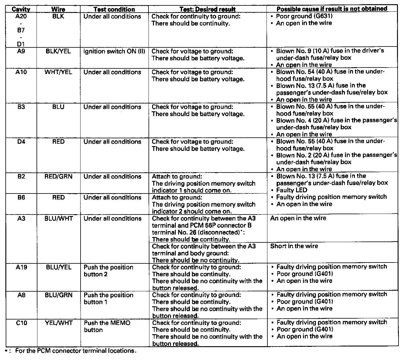 5. Reconnect the connectors to the driver's power seat control unit, turn the ignition switch ON (II) to keep the system awake, and make these input tests at the connectors.