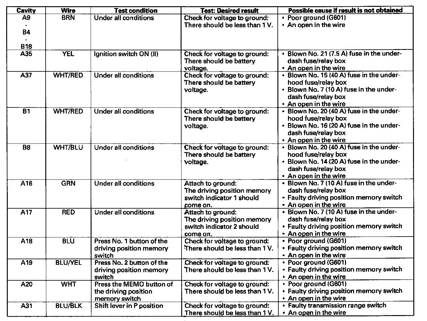 5. Reconnect the connectors to the power seat control unit, and make these input tests at the connectors.