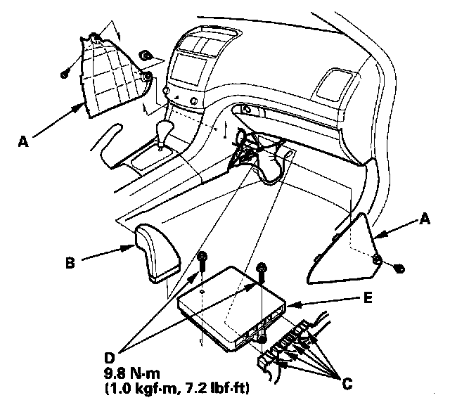 10. Remove the bolts (D), then remove the ECM/PCM (E).